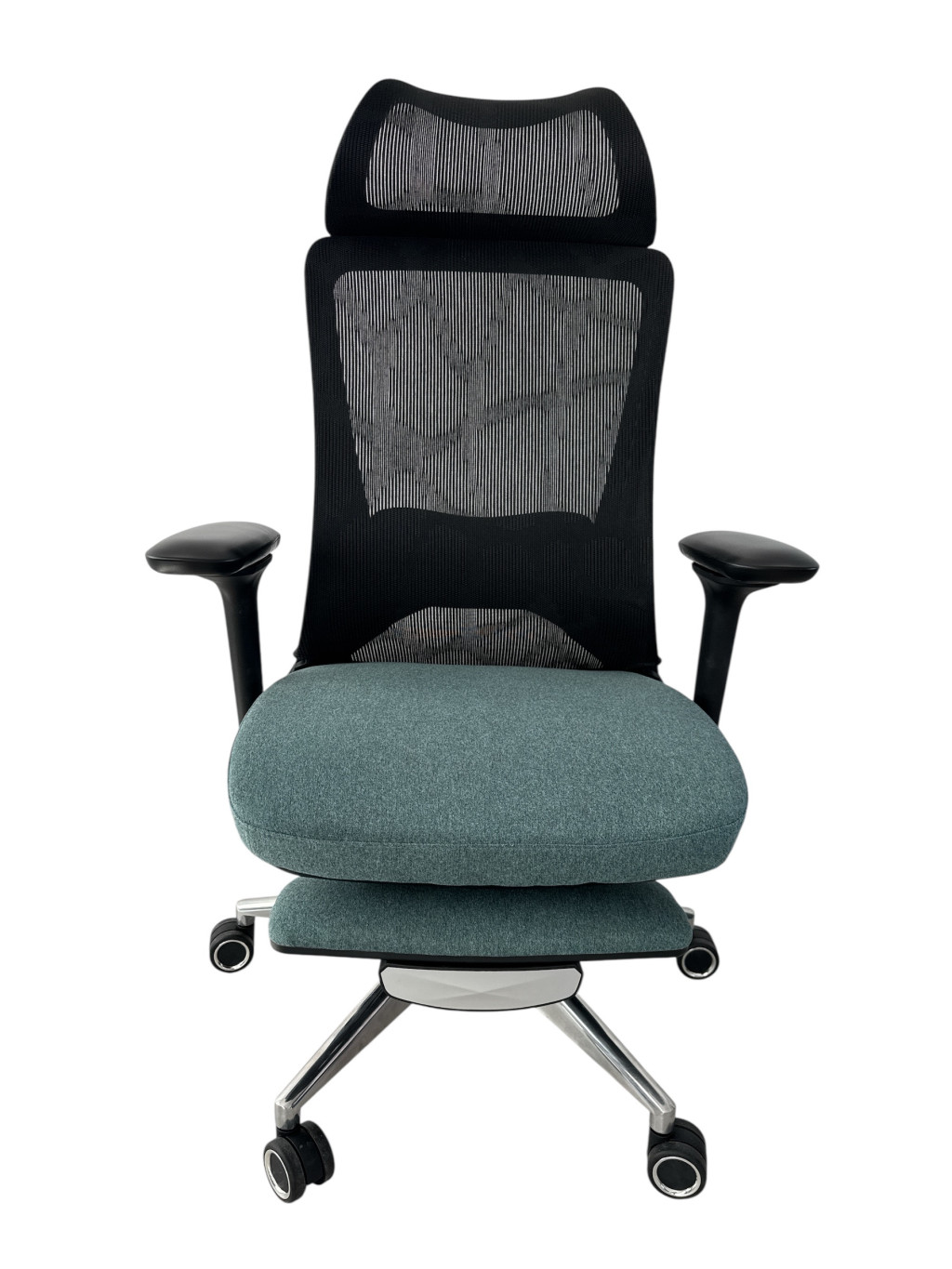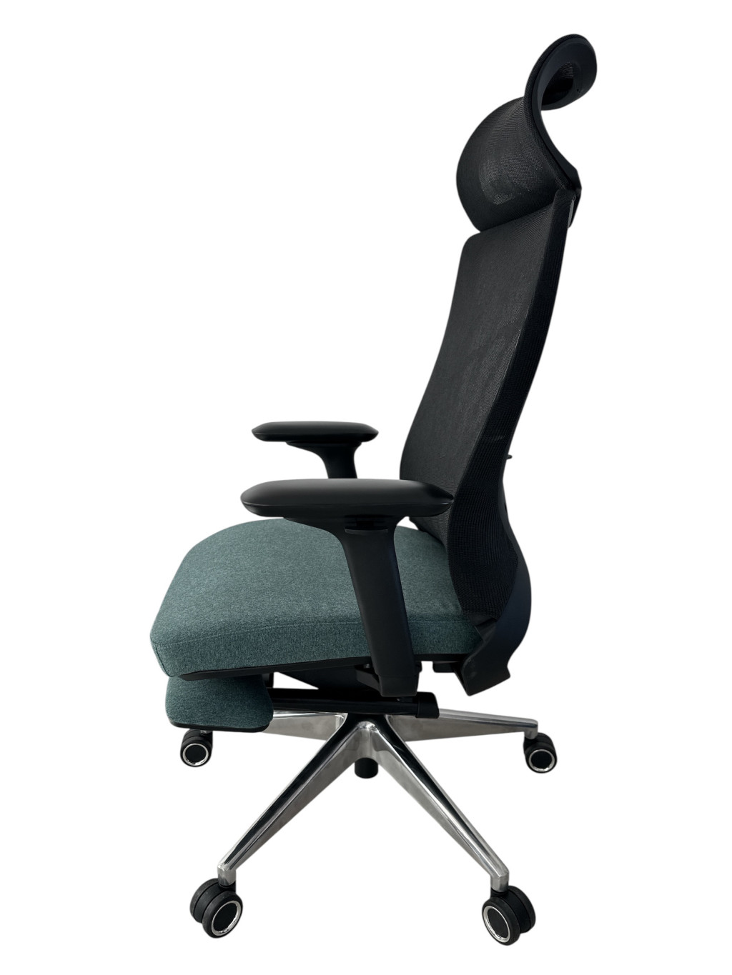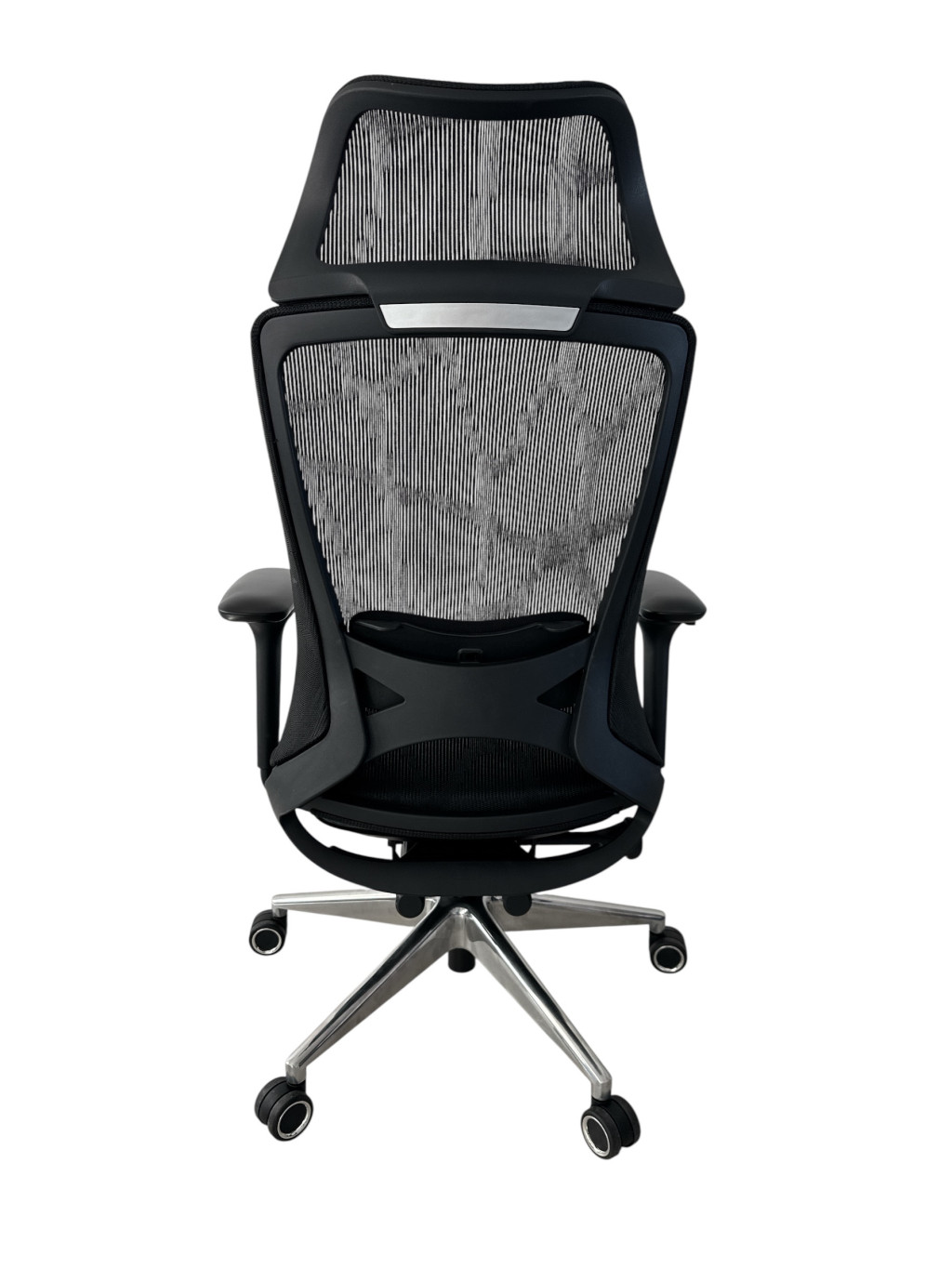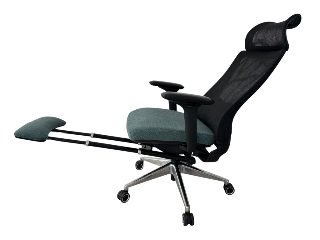 Irodai szék * Fejtámla: rögzíthető, hálós kivitel * Háttámla: légáteresztő mesh szövet, PA-nylon + üvegszálas keret * Deréktámasz: magasságban állítható * Ülőpárna: 60 kg/m3 sűrűségű, 50x53cm , formázott PU hab dekoratív burkolattal (lángálló szivacs) * Mechanika: testsúly-érzékeny, háromfokozatú hintamechanika * Kartámasz: 4D állítható, PU borítású karlap * Gázlift: 3. osztályú gázrugó * Talp: 340# alumíniumöntvény csillagtalp * Görgők: 60 mm átmérő fekete PU görgők * Lábtámasz: beépített, kihúzható lábtartó *