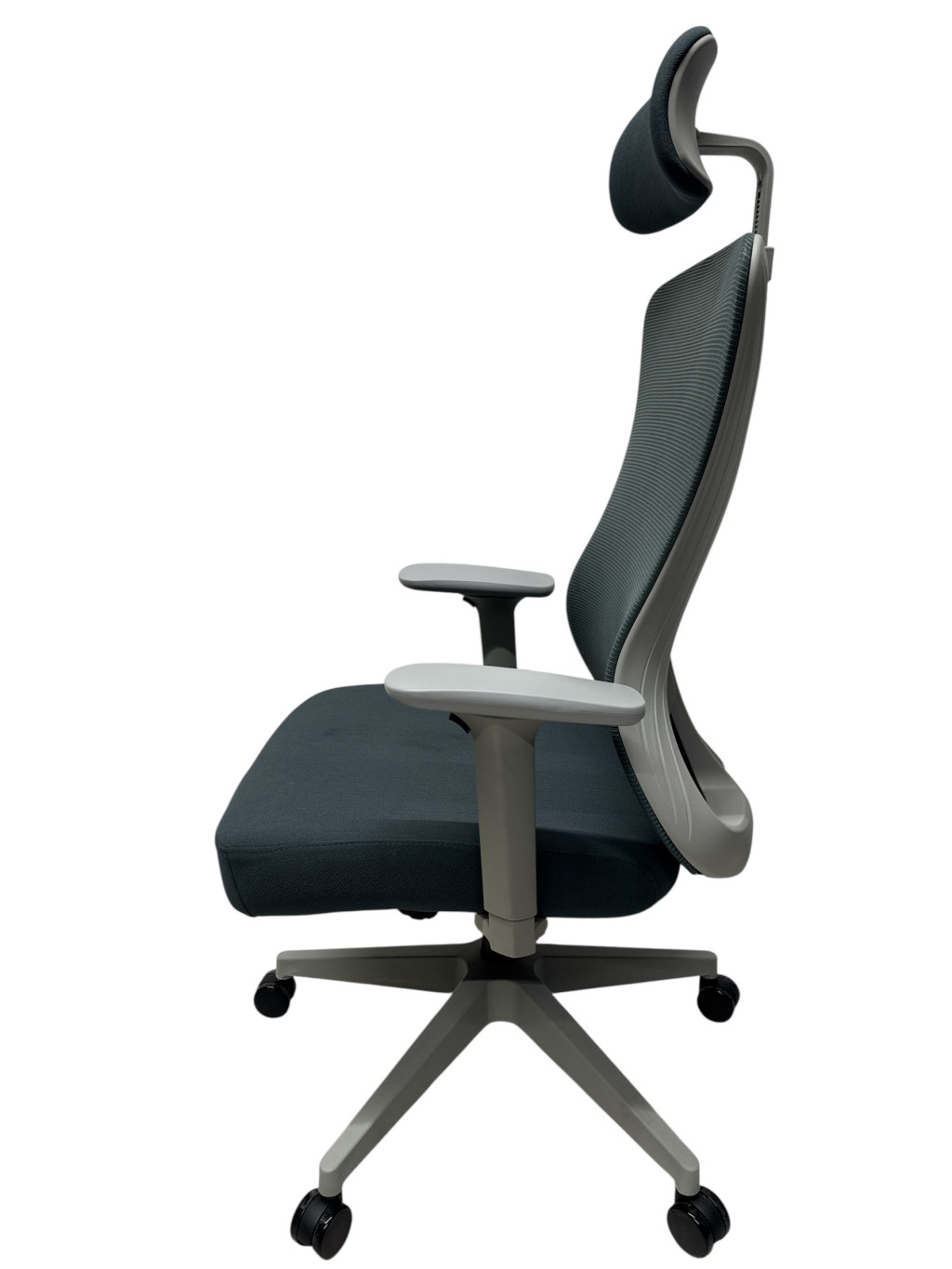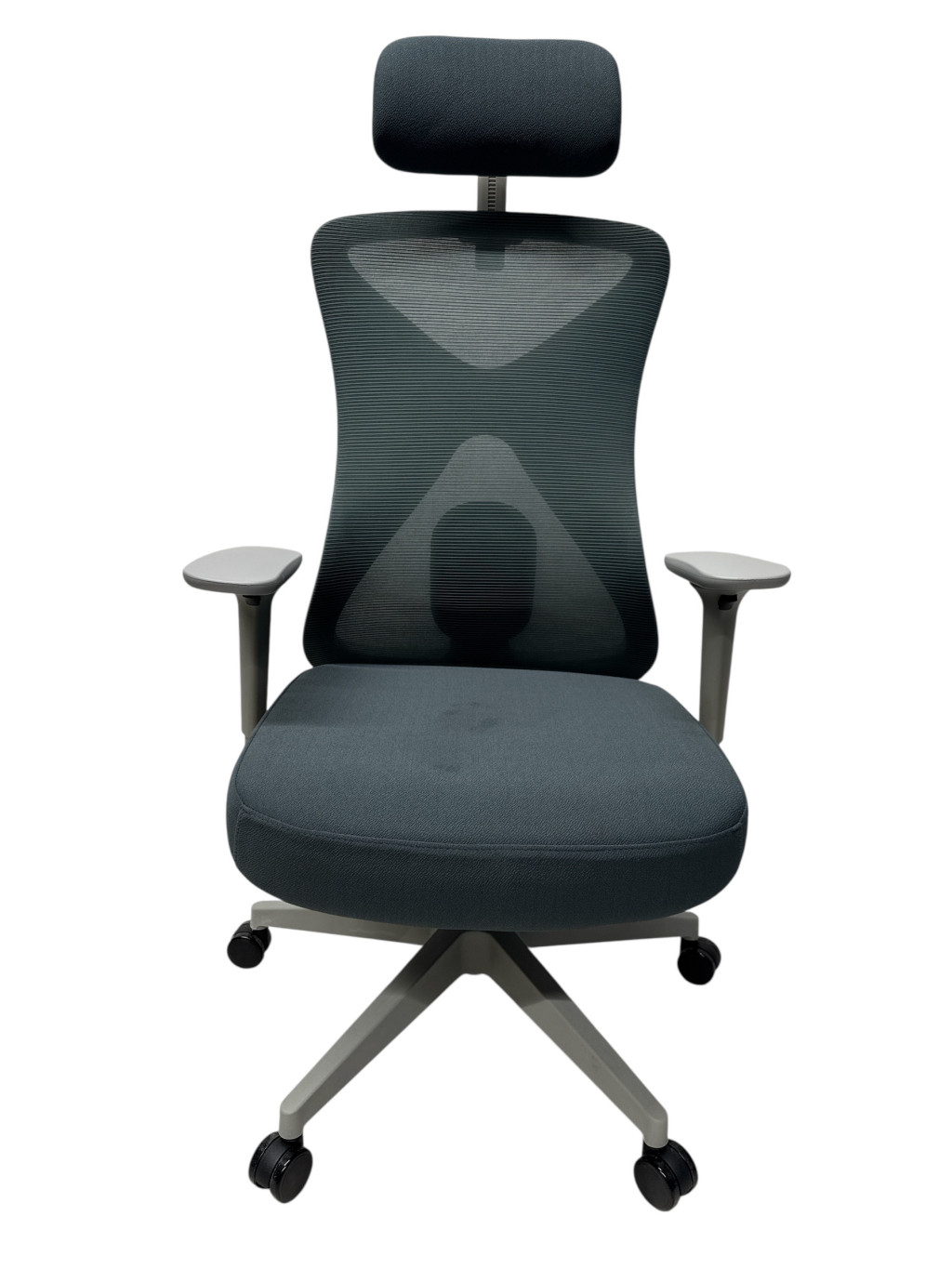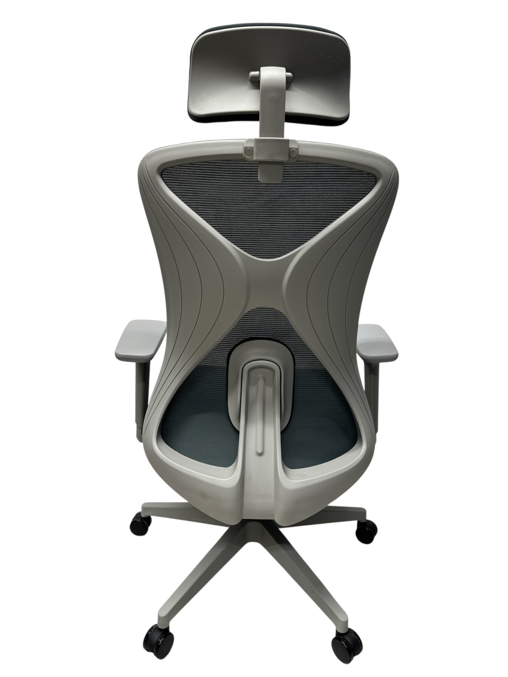 Irodai szék *Fejtámla: 2D fejtámla, fel-le állítható * Háttámla: légáteresztő hálós anyag, szürke PP vázzal *Deréktámasz: fel-le állítható * Ülőpárna: 60-as sűrűségű, 54x51 cm, PU öntött szivacs (lángálló szivacs) *Mechanika: egy fokozatban rögzíthető szinkrontiltó mechanika, fel-le állítható *Karfa: 3D állítható karfa * Gázlift: 3. osztályú gázrugó (100#6) * Talp: 340-es műanyag talp * Görgők: 55 fekete PU görgők *
