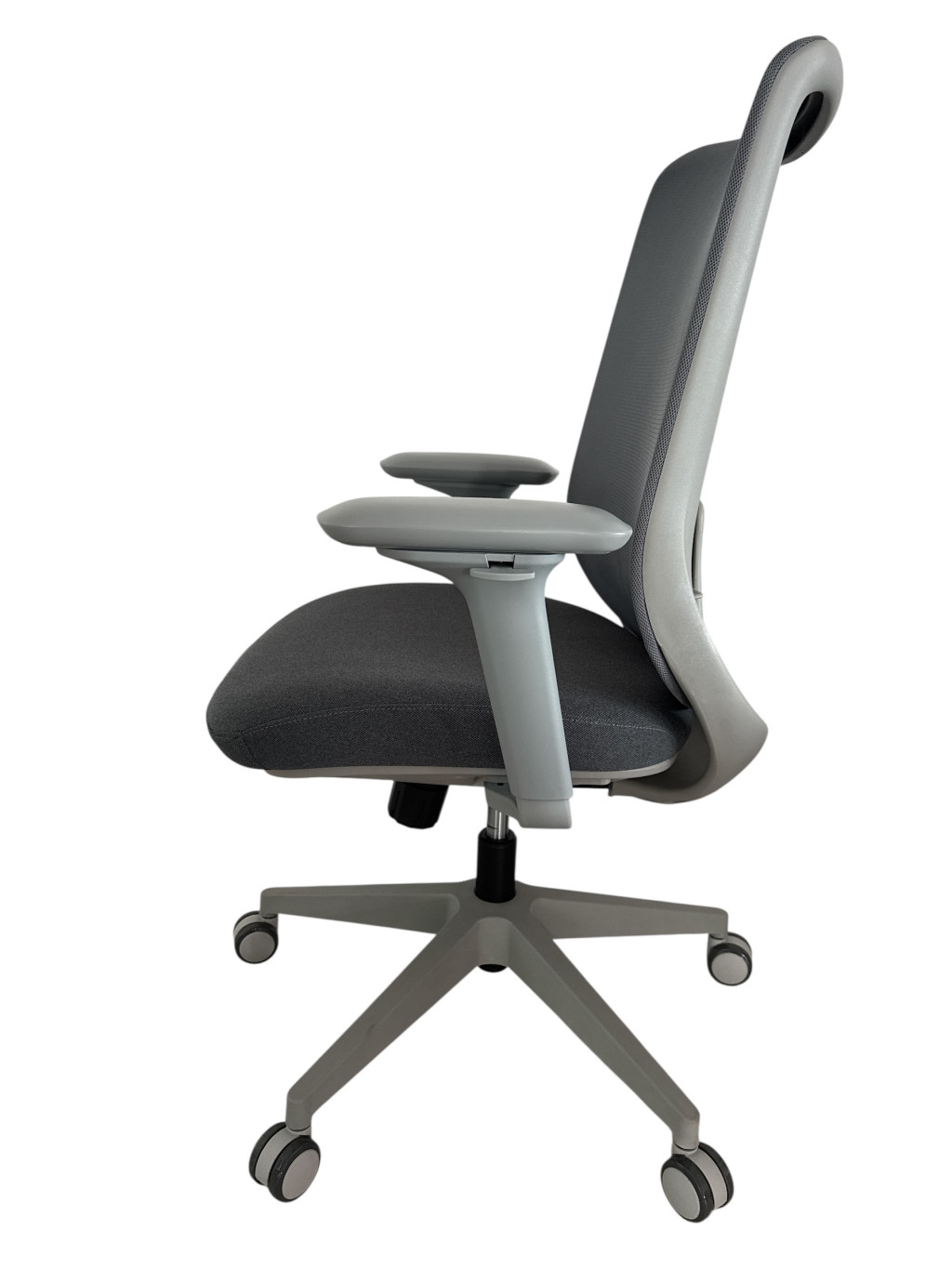 Irodai szék * Fejtámla: opcionális 3D kivitel* Háttámla: légáteresztő háló, PA szürke nylon + üvegszálas (GF) vázzal * Deréktámasz: magasságban állítható, PU anyagból * Mechanika: három fokozatban rögzíthető szinkron billenő mechanika, fel-le állítható * Ülőpárna: 60 kg/m3 sűrűségű, 50x53cm , öntött PU hab dekoratív burkolattal (lángálló szivacs) * Kartámasz: 4D állítható, PU borítású karlap * Gázlift: 3. osztályú gázrugó * Talp: 340-es csillagtalp * Görgők: 60 mm átmérő fekete PU görgők *