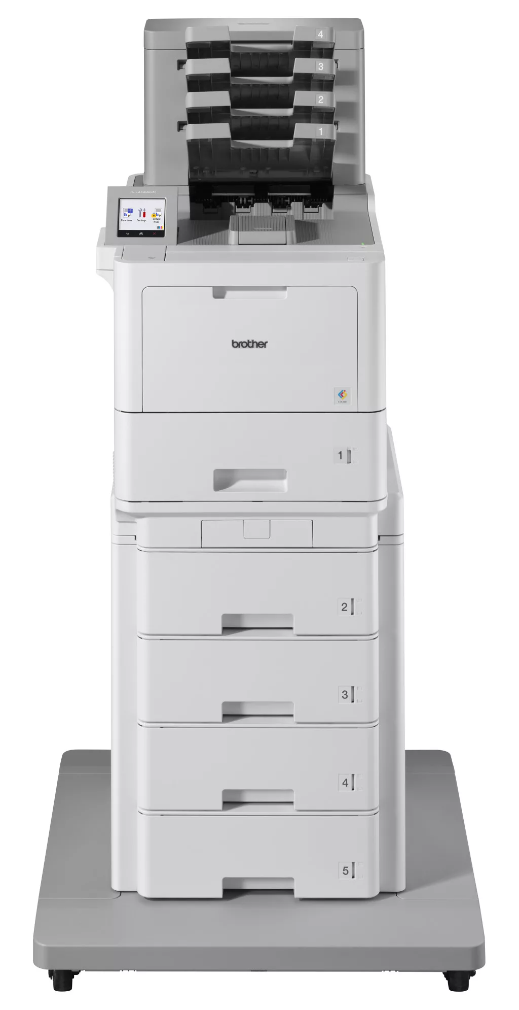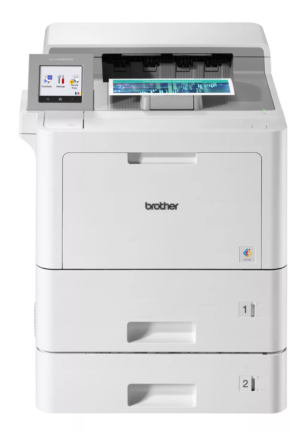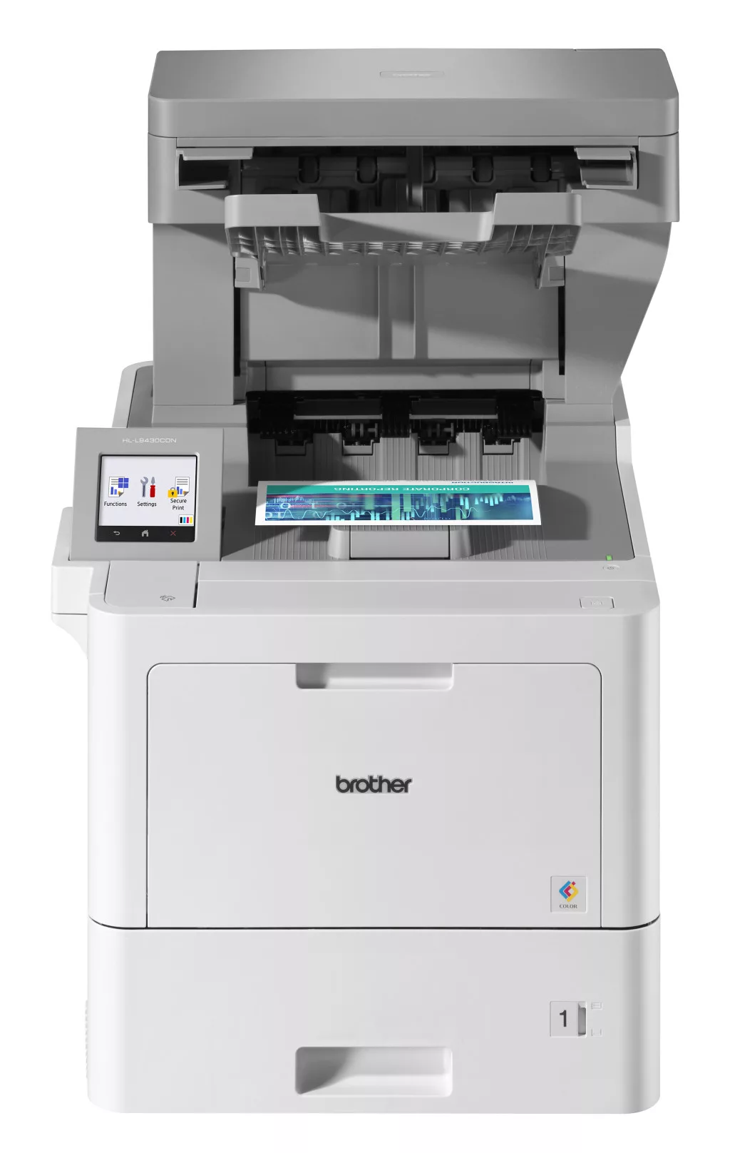 Hamarosan érkezik! ** Brother HLL9430CDN professzionális színes lézernyomtató * 40 lap/perc, duplex: 28 lap/perc * 2400 x 600 dpi * 1 GB memória * USB2, Gigabit hálózat, NFC, WiFi opció (WiFi direct) * Nyomtatás első és hátsó USB host csatlakozóról * NFC azonosítás és nyomtatás * 8,76 cm-es színes érintőkijelző * 520 + 100 lapos adagoló, max. 5 papírtálca (opció - max. 2.600 + 100 lap kapacitás) * Mobil nyomtatás: NFC, Apple AirPrint, Mopria, Brother Mobile Connect (Android&Apple AirPrint) * Terhelhetőség: 12.000 oldal/hó * Opciók: * tároló (MX-4000), tűző (SF-4000; tűzőkapocs: SR100 /2x5.000 db/) * WiFi modul: NC-9000w * Kártyaolvasó tartó: CH-1000 * Kellékek: * induló: BK: 9.000 oldal, színes: 6.500 oldal/szín (CYM) * TN821XL: BK: 12.000BK: oldal, színes: 9.000 oldal/szín (CYM) * TN821XXL: BK: 15.000BK: oldal, színes: 12.000 oldal/szín (CYM) * Dobegység: DR821CL: 100.000 oldal (3 oldal/feladat esetén) * Papírtovábbító szalag: BU800CL: 150.000 oldal (2 oldal/feladat esetén) * Hulladékfesték-kazetta: WT800CL: 100.000 oldal