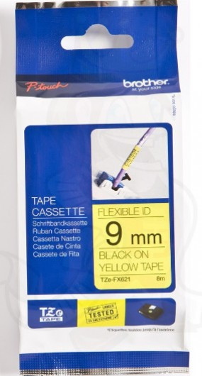 **TZe -FX621 flexibilis öntapadós laminált címkeszalag tartós feliratok nyomtatásához. Kábelek jelölésére ajánlott.** * Szalag típusa: Flexi ID laminált * Szalag szélessége: 9 mm * Szalag hossza: 8 m * Szalag színe: Sárga * Felirat színe: Fekete