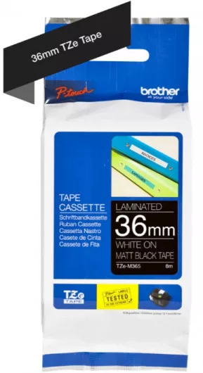 **TZe -M365 öntapadós laminált címkeszalag tartós feliratok nyomtatásához.** * Szalag típusa: Matt laminált * Szalag szélessége: 36 mm * Szalag hossza: 8 m * Szalag színe: Fekete * Felirat színe: Fehér