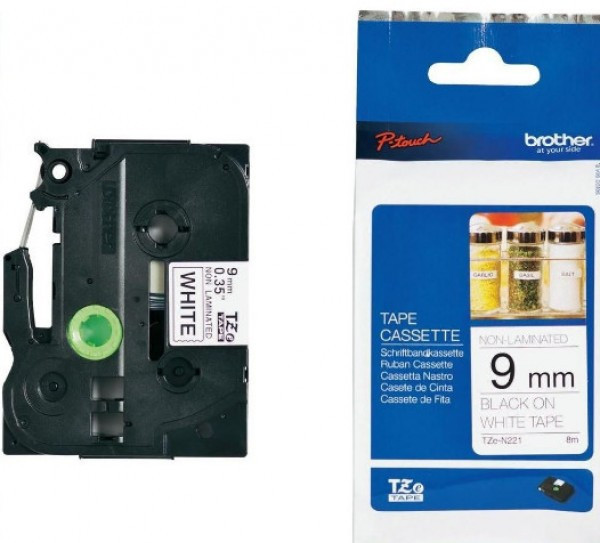 **TZe -N221 öntapadós címkeszalag NEM laminált feliratok nyomtatásához.** * Szalag típusa: NEM laminált * Szalag szélessége: 9 mm * Szalag hossza: 8 m * Szalag színe: Fehér * Felirat színe: Fekete