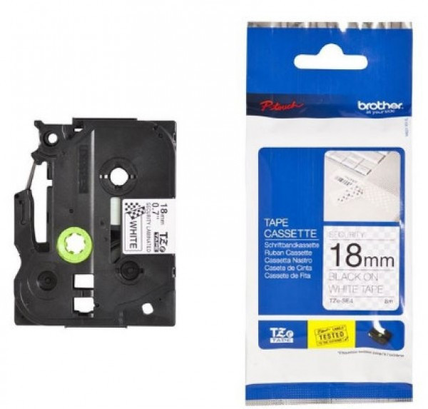 **TZe -SE4 biztonsági címkeszalag tartós, laminált feliratokhoz. * Szalag típusa: Biztonsági laminált * Szalag szélessége: 18 mm * Szalag hossza: 8 m * Szalag színe: Fehér * Felirat színe: Fekete
