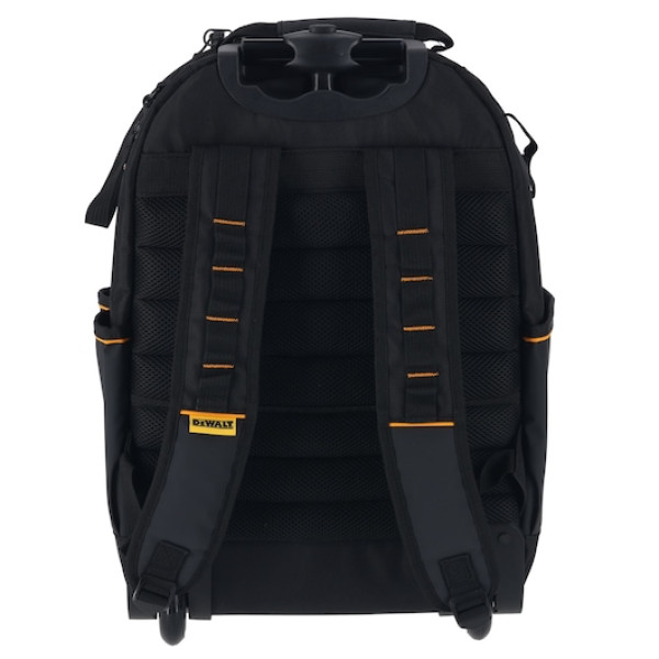 DWST60101-9 *DEWALT Hátizsák, McLaren, teleszkópos fogantyúval és kerekekkel *Anyag: erős, kopásálló poliészter *Markolat: teleszkópos fogantyú, kényelmes felső fogantyú *Kerekek: beépített strapabíró kerekek a könnyű szállításhoz *Tárolás: több rekesz és belső zseb a szerszámok rendszerezéséhez *Kialakítás: megerősített alap a stabilitásért *Kapacitás: nagy belső tárolótér szerszámok és tartozékok számára *Súly: 4,7 kg