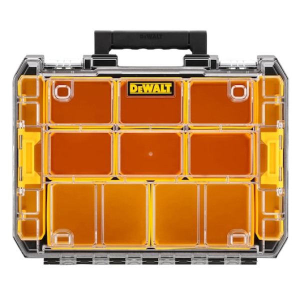 DWST82968-1 *DEWALT TSTAK IP54 Rendező *Kompatibilitás: TSTAK tárolórendszerrel kompatibilis *Védelem: IP54 por- és vízállóság *Kialakítás: átlátszó fedél, mozgásbiztos elválasztók *Zárás: erős fémcsatok *Anyag: ütésálló műanyag *További jellemzők: kivehető belső rekeszek a rugalmas rendszerezéshez