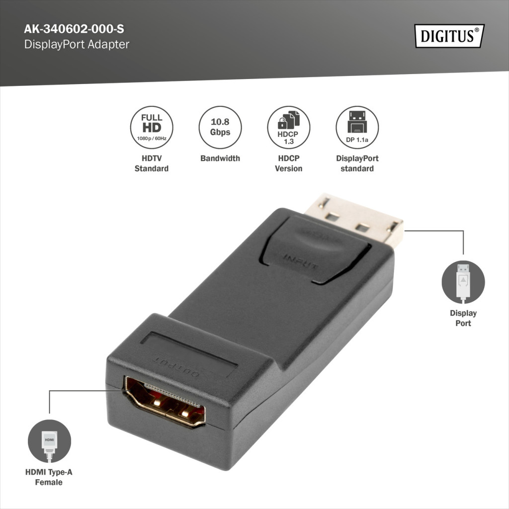 DIGITUS AK-340602-000-S Full HD 60Hz Dual-Mode 1.1a DisplayPort - HDMI type A adapter