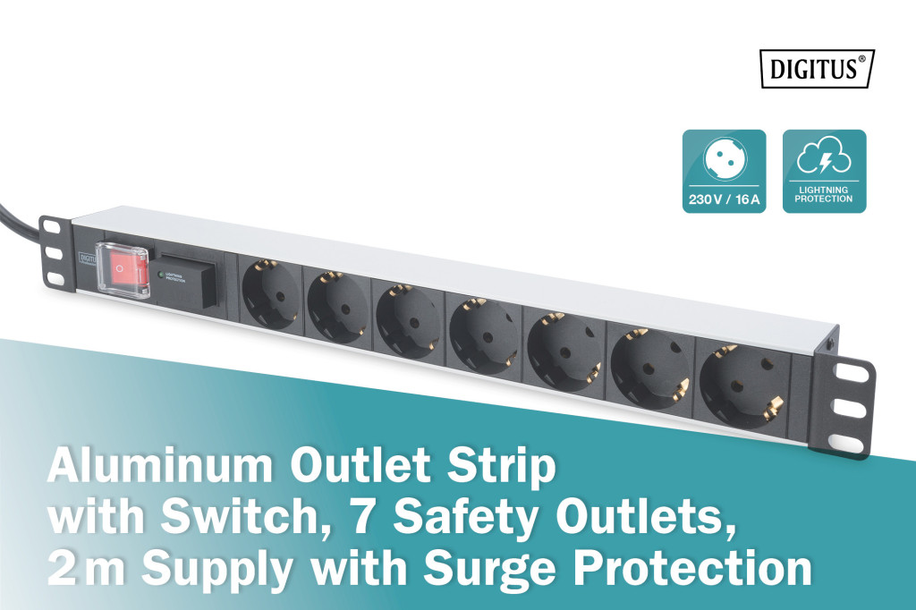 DIGITUS DN-95407 19 1U PDU 7xCEE 7/3 schuko aljzat CEE7/7 csatlakozó 2m túlfeszültségvédett elosztósor