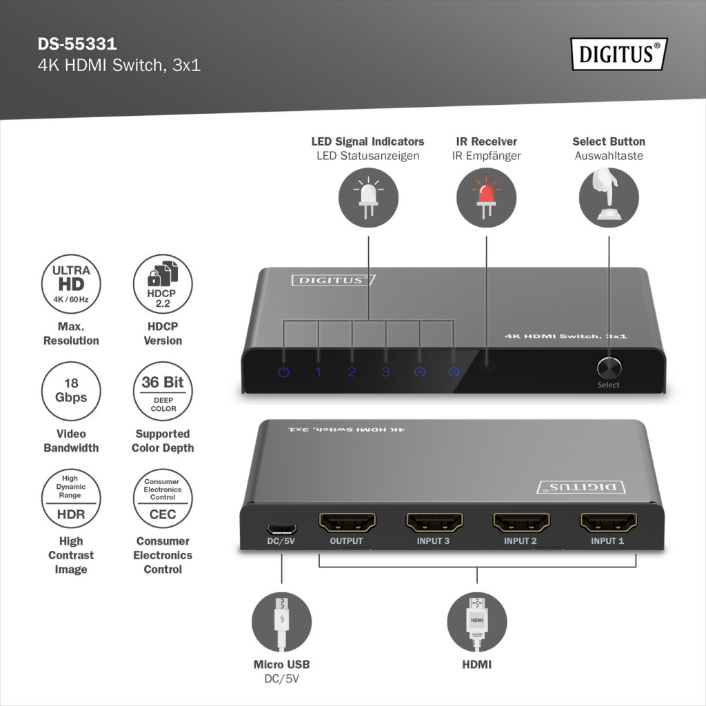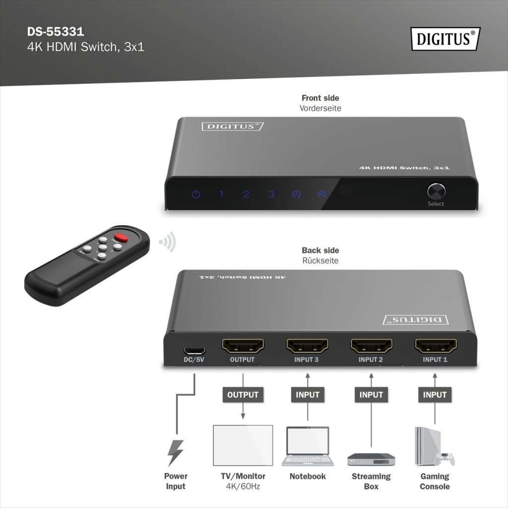 DIGITUS DS-55331 HDMI 4K 60Hz 3x1 Switch