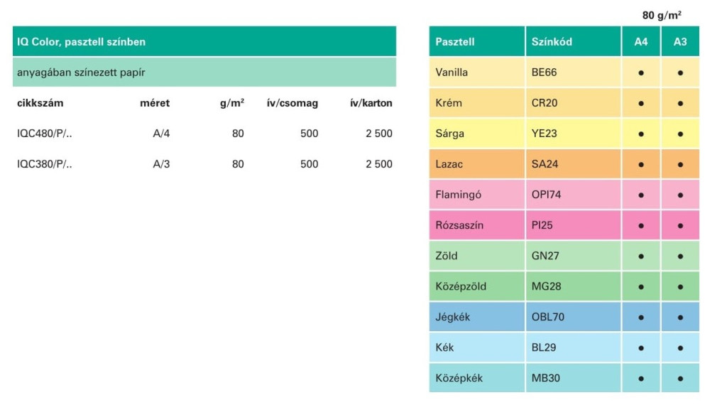 Sokoldalúan alkalmazható, magas minőségű, anyagában színezett IQ Color másolópapír. Kétoldalas másolásra és nyomtatásra is alkalmas, felhasználható tintasugaras- és lézernyomtatókba, másológépekbe. FSC, EU Ecolabel és Green Range tanusítvány. Kiszerelés: 500 ív/csomag; 5 csomag/doboz.