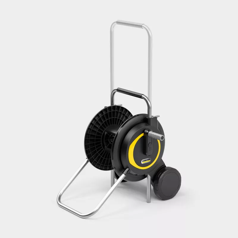 A stabil és robusztus tömlőszállító kocsi lehetővé teszi a kerti tömlő helytakarékos tárolását, és nagyon kényelmes a használata. A tömlő az ergonomikus kurbli segítségével megbízhatóan feltekerhető. A tömlőszállító kocsi a maximális stabilitást biztosító extra széles talppal, az UV- és fagyállósággal, valamint a fogantyún található praktikus fúvókatartóval is pontokat szerez. Az innovatív gyorskioldókaroknak köszönhetően a teleszkópos fogantyú kényelmesen beállítható a megfelelő magasságba, vagy egészen lefelé mozgatható. A Kärcher 5 év garanciát vállal. A tömlőkocsit teljesen összeszerelve szállítjuk.