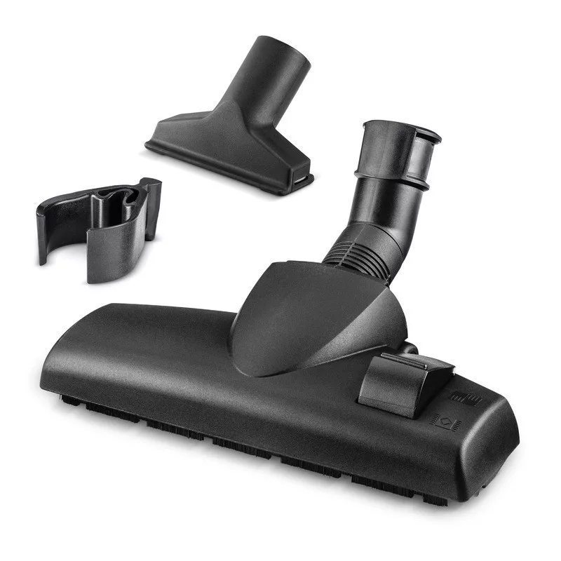 A háztartási készlet a kapcsolható száraz padlófúvókával és kárpitos fúvókával ideális tartozékokat tartalmaz számos gyakori háztartási tisztítási feladathoz. A padlófúvóka lábkapcsolóval kapcsolható, így szőnyegpadlóra és kemény padlóra egyaránt alkalmas, míg a két szálemelővel ellátott praktikus kárpitos fúvóka ideális a kárpitozott bútorok és más kárpitok kíméletes porszívózásához.