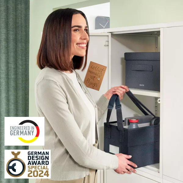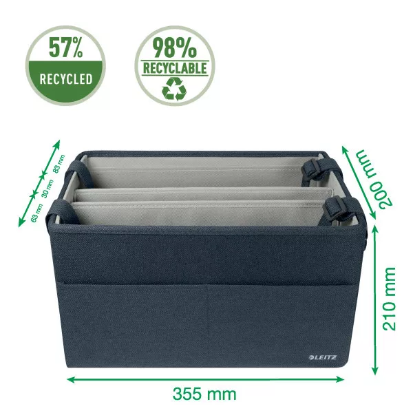 Érezd magadat otthon, bárhová is sodorjon a napod a Leitz Fabric tárolódoboz termékcsaláddal. Ezzel a minimál formatervezésű, attraktív megjelenésű tárolódobozzal stílusosan rendszerezheted munkaeszközeidet az irodában, otthon, vagy éppen útközben. A Leitz Fabric Hot Desking táska három különálló rekesszel rendelkezik, amelyekben kényelmesen elfér és könnyen hordozható minden, amire szükséged lehet a nap folyamán. Ez a modern és praktikus tárolótáska elegendő helyet biztosít egy legfeljebb 14" méretű laptop, egy teljes méretű billentyűzet, egy egér, egy töltőkábel, egy fejhallgató, egy füzet és egy kulacs számára. Elfér a min. 370 x 210 mm alapterületű és 220 mm magas polcokon, szekrényekben. Tanárok számára is ideális. Puha anyag borítás, újrahasznosított kartonpapír merevítéssel a szilárdság és a tartósság érdekében. 57%-ban újrahasznosított anyagból. Használaton kívül az összecsukható tárolódoboz teljesen összecsukható, így könnyen tárolható. Névcímkével a táska tulajdonosának könnyű beazonosításához. Ez az állítható hosszúságú fogantyúkkal rendelkező hot-desking hordozótáska tökéletes kiegészítője lehet otthonodnak, irodádnak vagy iskoládnak, hogy egész nap nyugodt és produktív maradhass.Összecsukható hot-desking tárolótáska, mely ideális az irodában, otthon, hibrid munkavégzéshez, vagy az iskolában.Egy max. 14" méretű laptop, egy kompakt billentyűzet, egy egér, egy töltőkábel, egy fejhallgató, egy füzet, egy kulacs és egyéb használati tárgyak tárolására tervezték; min. 480 x 210 mm alapterületű, és 220 mm magas polcokon vagy szekrényekben is elfér3 rekesszel rendelkezik a tartalom rendszerezésére, egy központi nagyobb rekesszel - laptop tárolására, valamint névcímkével - a táska egyszerű azonosításához a közös irodahelyiségekbenGyorsan és egyszerűen összeállítható, ragasztómentes kivitelTeljesen összecsukható, így használaton kívül tárolóhelyet takarít meg2 stílusos, állítható vállpánttal, amely kézben vagy vállon történő hordozásához is alkalmas;