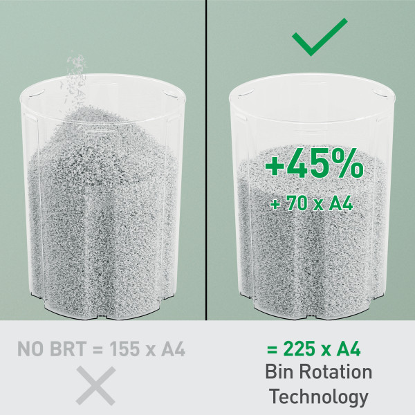 A Leitz IQ OptiMax Home Office iratmegsemmisítő nagy teljesítményű iratmegsemmisítést biztosít az egyedülálló tartályforgató (Bin Rotation Technology - BRT) technológiával, amely +45%-kal (70x extra A4-es lappal) növeli a tároló kapacitását, így ritkábban szükséges üríteni. Egyszerre akár 6x A4-es lap (80 g/m2) megsemmisítésére is alkalmas biztonságos, DIN P5 mikrokonfetti darabokra. A 15 literes tárolóban akár 225 lap is elfér - tökéletes a hatékony, nagy biztonságú iratmegsemmisítéshez. A Leitz IQ OptiMax Home Office iratmegsemmisítő innovatív, stílusos iratmegsemmisítő megoldást kínál kivételes adatbiztonság mellett. Ez a DIN P5 papír megsemmisítő egyszerre akár 6x A4-es lapot is könnyedén aprít fel mikrokonfetti darabokra, így tökéletes kis iratmegsemmisítő személyes és otthoni használatra. Egyedülálló tartályforgató technológiával (BRT) rendelkezik, amely +45%-kal* növeli a hulladéktartály kapacitását. A forgó tartály egyenletes papíreloszlást biztosít, megakadályozza a papírhegy kialakulását, és lehetővé teszi további 70x A4-es lap megsemmisítését egyetlen tartályürítés mellett. A tartályforgató technológiának köszönhetően a tartálytelítettség-jelző csak 100%-os töltöttségnél aktiválódik és a nagy méretű, 15 literes, 225 lap kapacitású tartály ritkább ürítést igényel. A kék színű, megvilágított tartállyal és az intuitív, könnyen követhető jelzéseket adó LED-es forgó kijelzővel az iratmegsemmisítés egyszerű és hatékony. Az otthoni munkaterületekhez tervezett Leitz IQ OptiMax 250 rendkívül csendes működést kínál, így ideális a közös használatú terekbe. Karcsú, kompakt, henger alakú kialakítása könnyedén illeszkedik szűk helyekre, és kisebb helyiségekbe is. A 20 perces folyamatos üzemidővel ez a megbízható iratmegsemmisítő gép zökkenőmentes iratmegsemmisítést biztosít, amikor csak szükséges. *Leitz IQ OptiMax 250 teszt rotációs technológiával és anélkül.Egyszerre akár 6x A4-es papírlapot (80 g/m2) is megsemmisít mindössze 6 másodperc alatt nagy biztonságú P5-ös