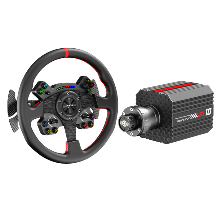 A PXN VD10 direkt meghajtású kormánybázis egy 20-pólusú, alacsony tehetetlenségű szervómotorral rendelkezik, amely folyamatosan 10Nm, csúcsban 12Nm nyomatékot biztosít.A 24 bites mágneses enkóder, a többmagos processzor, valamint a Sense+ algoritmus révén precíz force feedback élményt nyújt - pontosan visszaadja az útfelület textúráját, a gumik csúszását és a kanyarodási dinamikát.A masszív alumínium váz és az intelligens hőszabályozó rendszer garantálja a stabil teljesítményt hosszú versenyek alatt is.A 33 cm-es WCS R2 versenykormány könnyű alumíniumötvözet vázzal és mikroszálas bőrborítással rendelkezik, így kiváló tapadást és kényelmet biztosít.Felszereltsége: 13 programozható gomb, ebből 12db testreszabható RGB világítással, 2 forgó enkóder, 4 alumínium váltófül (ebből 2 mágneses és 2 analóg lineáris)