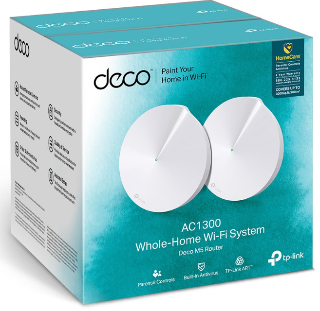 A Deco egység használata zökkenőmentes, teljes otthoni Wi-Fi lefedettséget biztosít - végleg kiküszöböli a gyenge jelű területeket!A fejlett Deco Mesh technológiával az egységek együttműködve egyetlen, az egész otthonra kiterjedő hálózatot alkotnak, ugyanazzal a hálózatnévvel. Az eszközök a lehető leggyorsabb sebesség érdekében automatikusan váltanak a Decók között, miközben Ön otthonában mozog.A Deco M5 kétcsomagos Wi-Fi-t akár 3800 négyzetláb területre biztosít. És ha ez nem elég, egyszerűen adjon hozzá további Deco-kat a hálózathoz a lefedettség növelése érdekében.A Deco M5 gyors és stabil kapcsolatot biztosít akár 1267 Mbps sebességgel, és együttműködik a nagyobb internetszolgáltatókkal (ISP) és modemekkel.A Deco még a legforgalmasabb hálózatokról is képes kezelni a forgalmat, így több mint 100 eszköz számára biztosít késésmentes kapcsolatot.A TP-Link HomeCare TM személyre szabott és biztonságos funkciókat kínál, beleértve a szülői felügyeletet, a beépített víruskeresőt és a szolgáltatásminőséget (QoS).A beállítás minden eddiginél egyszerűbb a Deco alkalmazással, amely végigvezeti Önt minden lépésen.