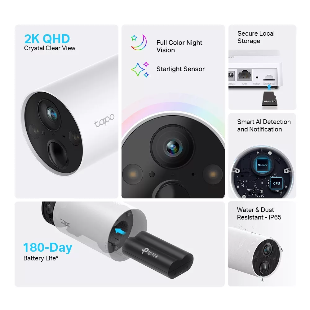 Tapo C420S1Smart Wire-Free Security Camera System, 1-Camera System2K QHD - Most 1,7-szer több pixellel, mint az 1080p, így tisztább videókat és képeket biztosít.180 napos akkumulátor-üzemidő* - Az újratölthető és kivehető akkumulátor alacsony fogyasztású protokollal meghosszabbítja a használati időt.Teljes színes éjszakai látás - A Starlight érzékelővel éjszaka is élénk színekkel és részletgazdag képekkel élvezheti a felvételeket.Intelligens AI-érzékelés és értesítés - Az intelligens AI azonosítja az embereket, háziállatokat és autókat, és szükség esetén értesíti a felhasználókat.Vezetékmentes elhelyezés - A vezetékek hiánya azt jelenti, hogy a kamerákat szinte bárhová elhelyezheti beltéren vagy kültéren - ahogyan Önnek megfelel!Fény- és hangriasztás - Mozgás érzékelésekor hang- és fényjelzést ad riasztásként.Kétirányú hang - Lehetővé teszi a kommunikációt a beépített mikrofonon és hangszórón keresztül.Rugalmas tárolási lehetőségek - A rögzített videókat a hubban lévő microSD-kártyára? (akár 256 GB-ig) vagy a Tapo Care** felhőalapú tárhelyszolgáltatásainak használatával mentheti.IP65 víz- és porállóság - Kiváló víz- és porállóságot biztosít kültéri használatra.