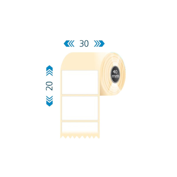 **Tekercses fehér címke** *Címke mérete: 30*20 mm (szélesség x futásirány) *Alapanyag: Papír *Ragasztó: erős *Egy tekercsen lévő címkék száma: 3500 db címke / tekercs *Tekercs belső átmérője: 40 mm *Külső tekercsátmérő: 120 mm
