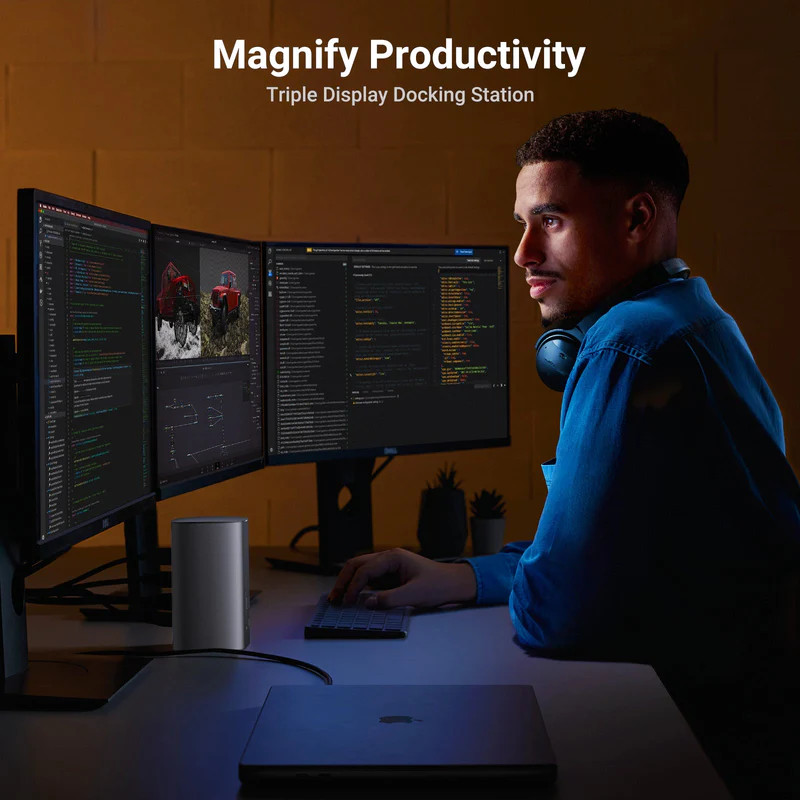 A UGREEN dokkoló állomás biztosan megfelel a mindennapi munka igényeinek. Akár 12 portot kínál, köztük HDMI, USB, Rj45 és SD/TF kártyahelyet. Mi több, lehetővé teszi a képek megjelenítését 3 különböző monitoron a további kényelem érdekében. Magas képminőséget, gyors adatátvitelt és azonnali készüléktöltést biztosít. Ezenkívül kompatibilis a macOS és a Windows operációs rendszerekkel. A csomagban egy 100 W-os USB-C kábelt is talál. * Fájlok gyors átvitele: Fontos számára a gyors adatátvitel? Akkor válassza a UGREEN 9032-t. A dokkoló állomás több porttal van felszerelve, amelyek lehetővé teszik, hogy pillanatok alatt átvihesse a fájlokat. Rendelkezésére állnak: USB-C3.1 (10 Gbps), USB-A3.1 (10 Gbps), 2x USB-A3.0 (5 Gbps) és SD/TF (104 Mbps). * Kényelmesen töltheti készülékét: Ne várjon túl sokáig, amíg készüléke feltölt. A dokkoló állomás és a mellékelt kábel lehetővé teszi, hogy a PD100W segítségével gyorsan megújíthasd iPhone készüléked energiáját. Egy 15"-es MacBook Pro-t pedig 85 wattos teljesítménnyel körülbelül 1,5 óra alatt tölt fel. * Bővíthető képernyő: Dolgozzon kényelmesebben a UGREEN 90325 segítségével. A dokkoló állomás fejlett DiplayLink technológiát kínál, amely egyszerre 3 monitort támogat macOS és Windows esetén. Használhat kiterjesztett vagy tükrözési módot a nagyobb szabadság érdekében. Ehhez telepítse az illesztőprogramokat a CD-ről (mellékelve). * Magas képminőség: Nézze kedvenc filmjeit új és jobb minőségben. Az állomás 2 HDMI portot kínál 8K@30Hz és 4K@60Hz felbontáshoz, valamint egy DisplayPort bemenetet 4K@60Hz felbontással. Eközben a HDR technológia befolyásolja a képdinamikát, javítja a képminőséget és a kontrasztot a legjobb vizuális élmény érdekében. * További lehetőségek: A UGREEN 90325 dokkoló állomás kompatibilis a Windows és a macOS rendszerrel, így sikeresen csatlakoztathatja a hardveredhez. Mi több, támogatja az M1/M2 chipeket a hatékony működés érdekében. Ezen kívül egy Rj45-ös portot kínál, amely 1000 Mbps-os internetkapcsolatot bi