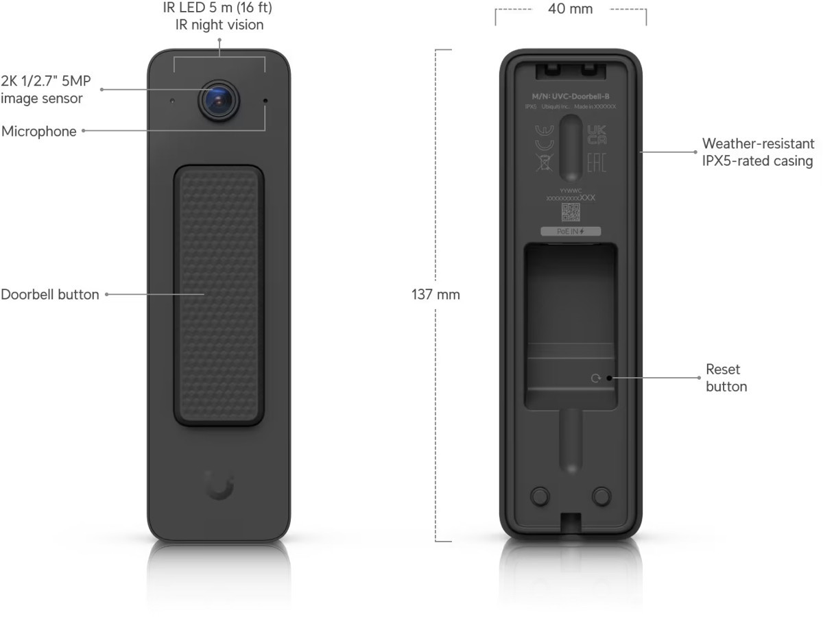 Ubiquiti UniFi Protect UVC-DOORBELL-LITE-B 1xFE LAN port IPX5 5MP IR fekete videós kapucsengő